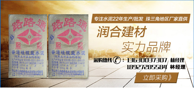 佛山市潤合建材公司 簡稱:廣東潤合。專注水泥22年生產/批發。主營:PC32.5R、PO42.5R、P1142.5R、PO52.5R華潤水泥、三虎水泥、海螺水泥、飛鹿水泥、路路通水泥、長力水泥。及C20、C25、C30、C35、C40、等C60以下混凝土。各大水泥品牌,在水泥采購商中享有較高的品質認可,廣東潤合與多家世界500強企業中鐵、中交、中國建筑和知名房企保利地產、碧桂園地產、龍光地產、美的地產長期合作。各品牌水泥有較大價格優勢,及水泥運輸配送優勢。佛山潤合水泥建材公司,將以薄利多銷及全心全意服務每位客戶。